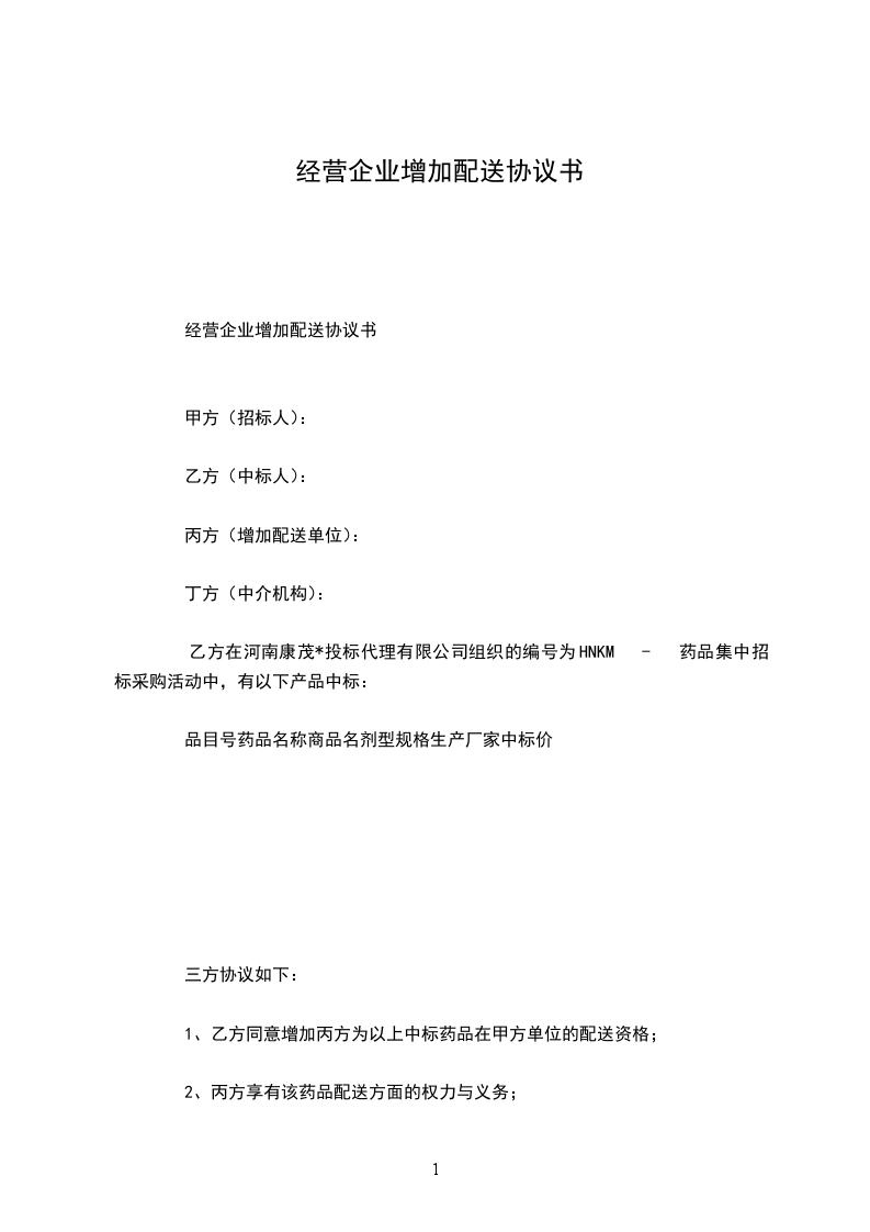 1、乙方同意增加丙方为以上中标药品在甲方单位的配送资格;