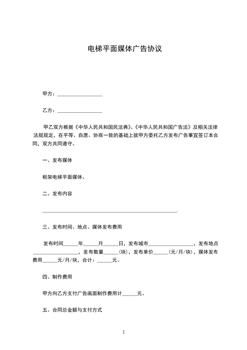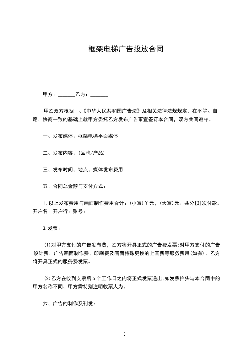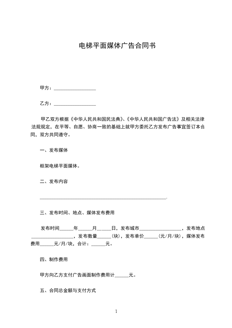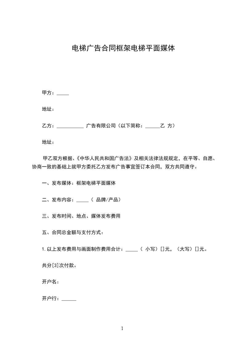 根据《中华人民共和国广告法》,及国家有关法律、法规的规定,甲、乙双方在平等、自愿、等价有偿、公平、诚实信用的基础上,经友好协商,就乙方在甲方__________楼宇的电梯厢内安装装饰镜框,用环境装饰及刊登商业广告等事宜,达成一致意见,特签订本合同,以资信守。