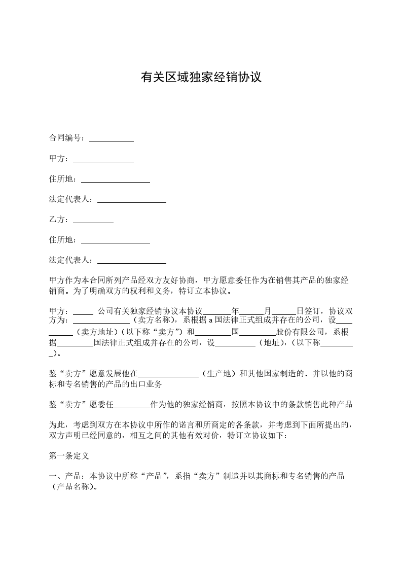 二、地区:本协议中所称“地区”,系指_______________(地区名)和随时经双方以书面同意的其他地区。