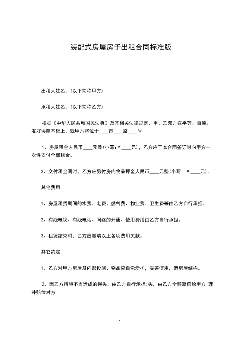 1、房屋租金人民币____元整(小写:¥____元),乙方应于本合同签订时向甲方一次性支付全部租金。