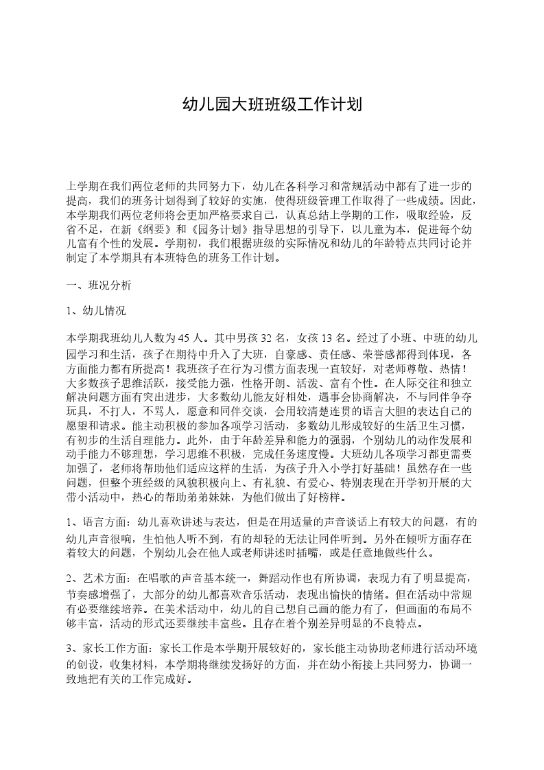 本学期我班幼儿人数为45人。其中男孩32名,女孩13名。经过了小班、中班的幼儿园学习和生活,孩子在期待中升入了大班,自豪感、责任感、荣誉感都得到体现,各方面能力都有所提高!我班孩子在行为习惯方面表现一直较好,对老师尊敬、热情!大多数孩子思维活跃,接受能力强,性格开朗、活泼、富有个性。在人际交往和独立解决问题方面有突出进步,大多数幼儿能友好相处,遇事会协商解决,不与同伴争夺玩具,不打人,不骂人,愿意和同伴交谈,会用较清楚连贯的语言大胆的表达自己的愿望和请求。能主动积极的参加各项学习活动,多数幼儿形成较好的生活卫生习惯,有初步的生活自理能力。此外,由于年龄差异和能力的强弱,个别幼儿的动作发展和动手能力不够理想,学习思维不积极,完成任务速度慢。大班幼儿各项学习都更需要加强了,老师将帮助他们适应这样的生活,为孩子升入小学打好基础!虽然存在一些问题,但整个班经级的风貌积极向上、有礼貌、有爱心、特别表现在开学初开展的大带小活动中,热心的帮助弟弟妹妹,为他们做出了好榜样。