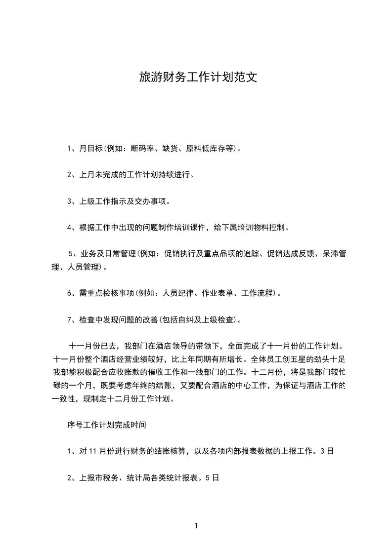 十一月份已去,我部门在酒店领导的带领下,全面完成了十一月份的工作计划。十一月份整个酒店经营业绩较好,比上年同期有所增长。全体员工创五星的劲头十足,我部能积极配合应收账款的催收工作和一线部门的工作。十二月份,将是我部门较忙碌的一个月,既要考虑年终的结账,又要配合酒店的中心工作,为保证与酒店工作的一致性,现制定十二月份工作计划。