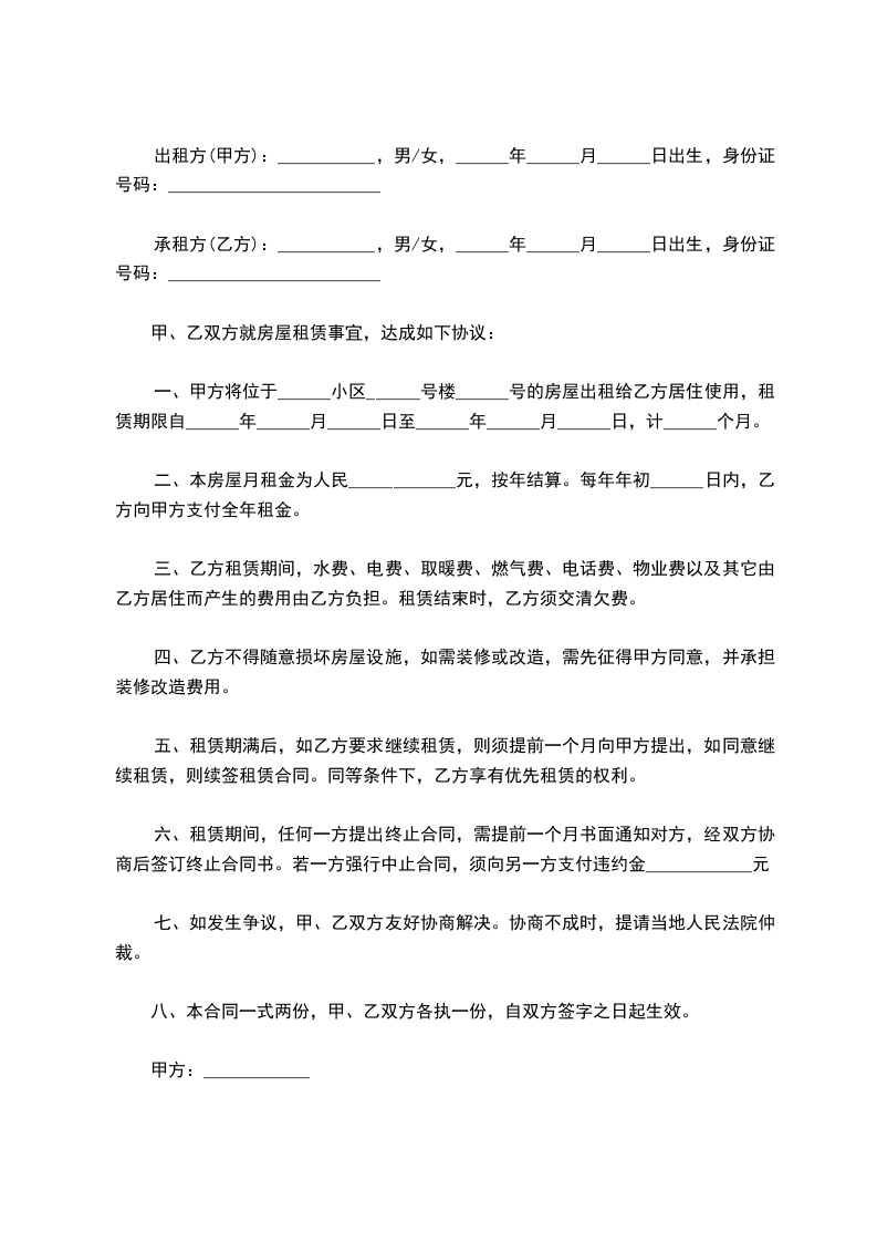 一、甲方将位于______小区______号楼______号的房屋出租给乙方居住使用,租赁期限自______年______月______日至______年______月______日,计______个月。