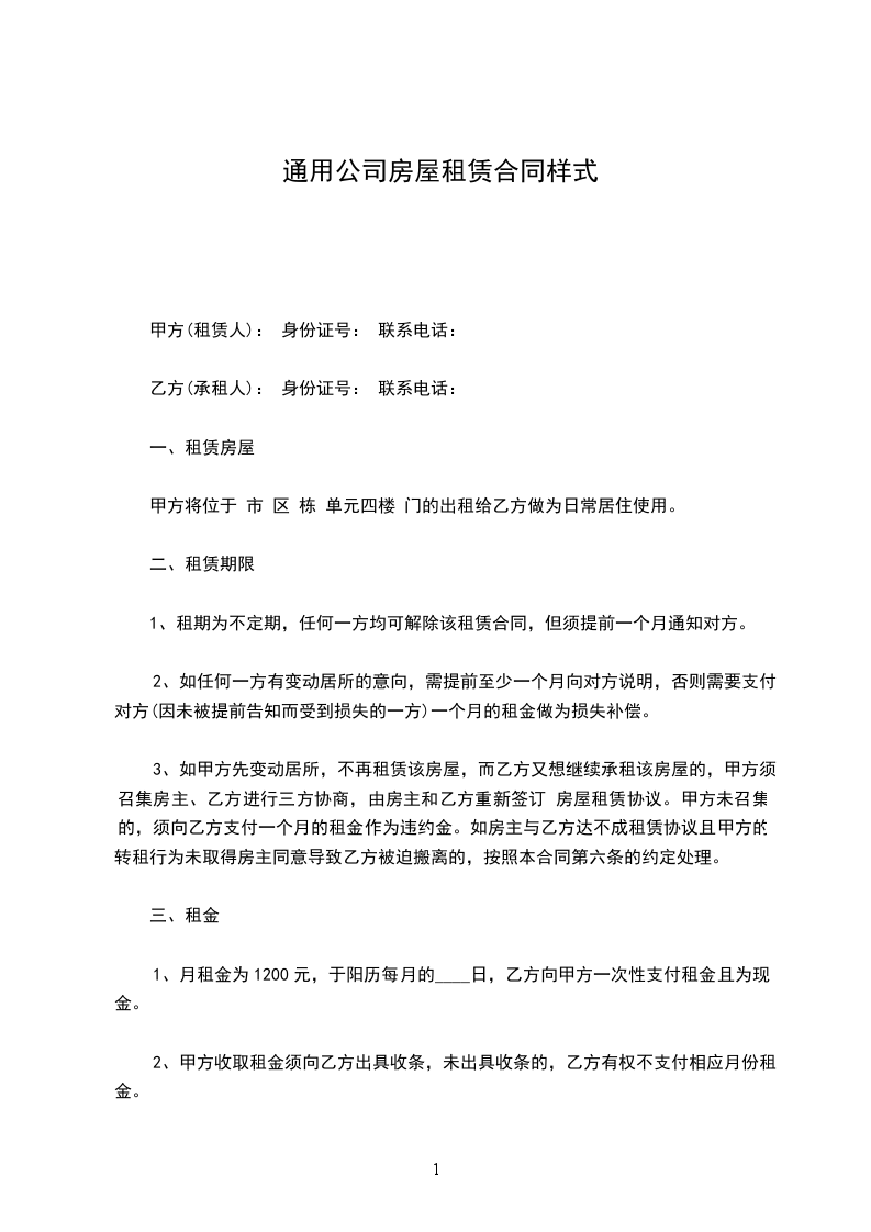 1、月租金为1200元,于阳历每月的____日,乙方向甲方一次性支付租金且为现金。