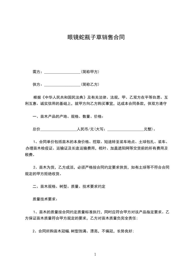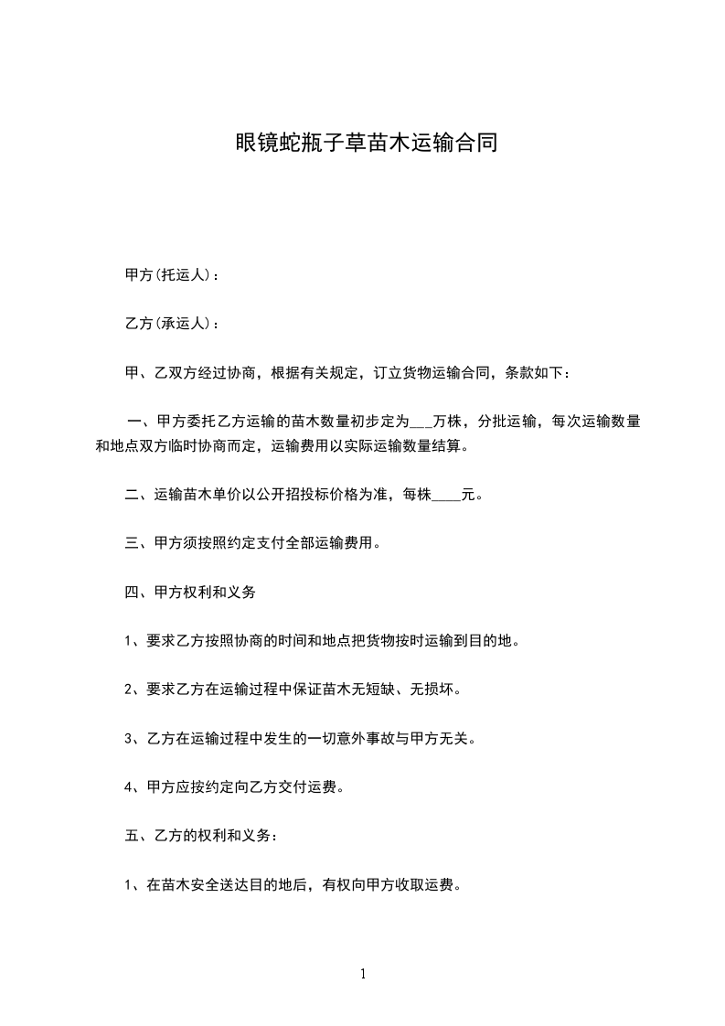 一、甲方向乙方采购苗木_______株,金额为人民币________.甲方与乙方按实际采购苗木数量,按实结算。