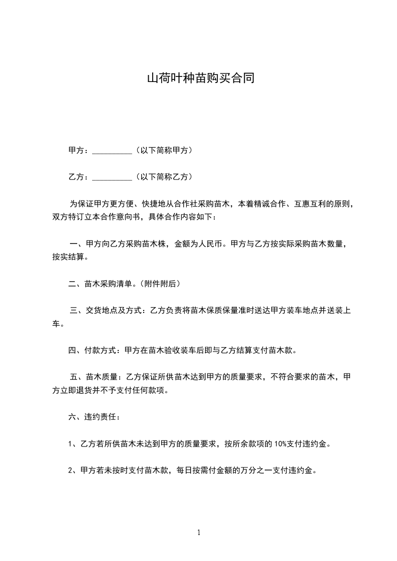 4、本合同为苗木买卖合同,乙方不承担甲方苗木成活率任何风险,但有为甲方提供技术指导的义务。