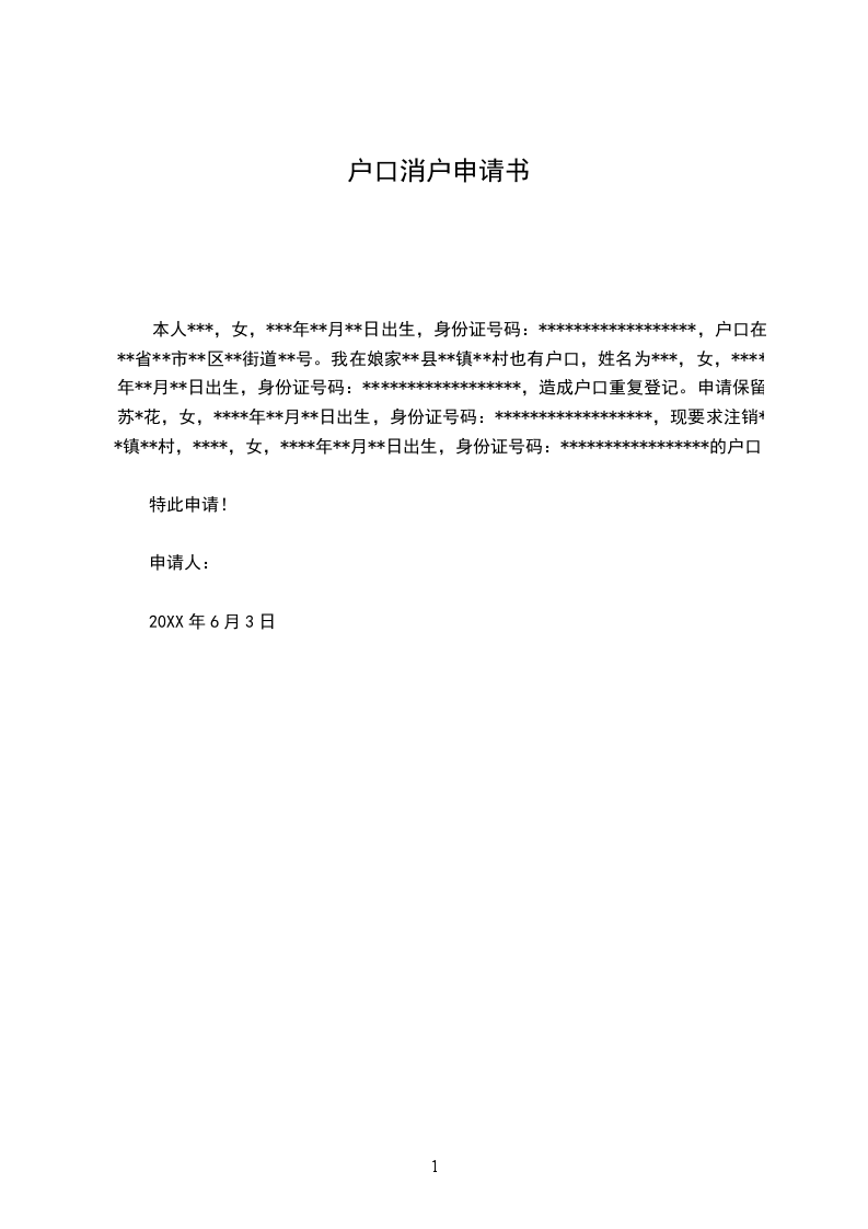 本人***,女,***年**月**日出生,身份证号码:******************,户口在**省**市**区**街道**号。我在娘家**县**镇**村也有户口,姓名为***,女,****年**月**日出生,身份证号码:******************,造成户口重复登记。申请保留苏*花,女,****年**月**日出生,身份证号码:******************,现要求注销**镇**村,****,女,****年**月**日出生,身份证号码:*****************的户口。