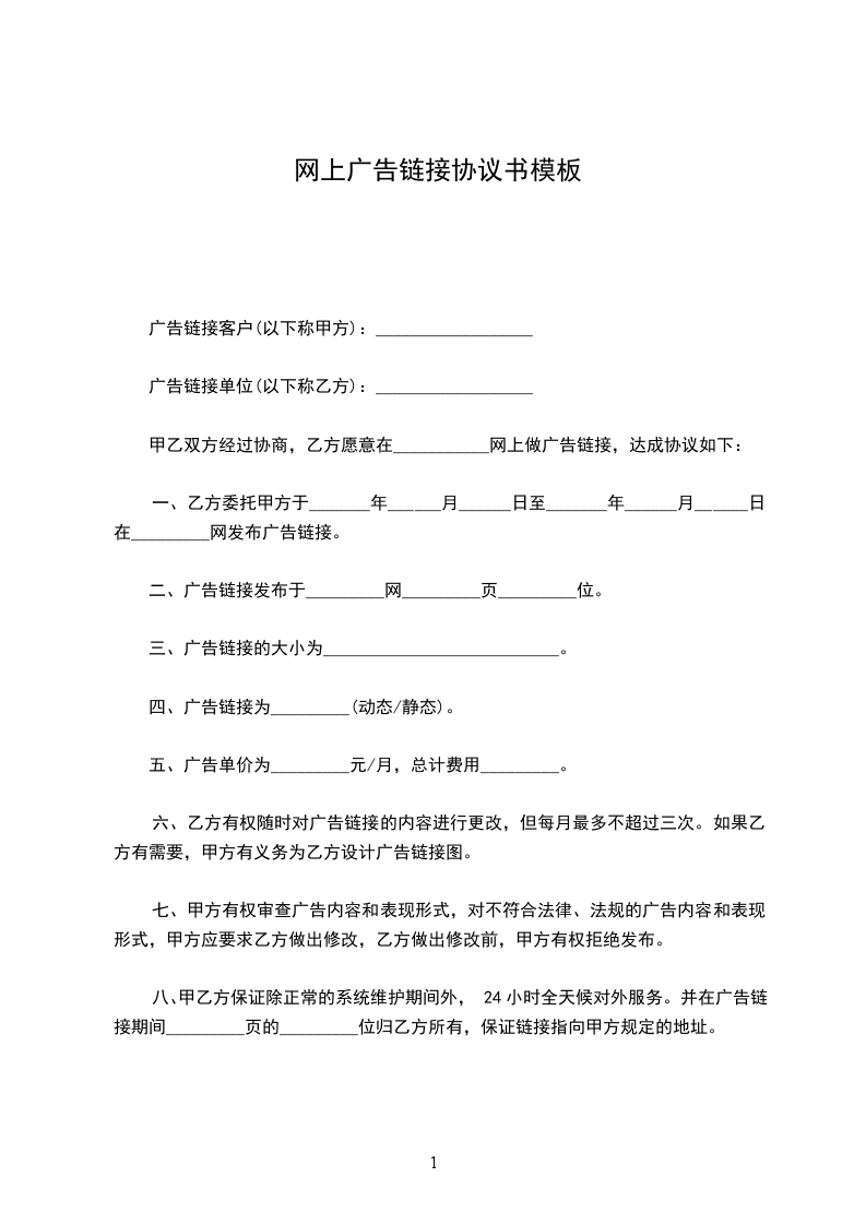 八、甲乙方保证除正常的系统维护期间外,24小时全天候对外服务。并在广告链接期间_________页的_________位归乙方所有,保证链接指向甲方规定的地址。