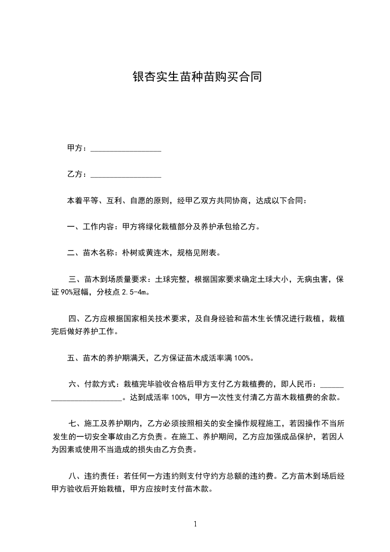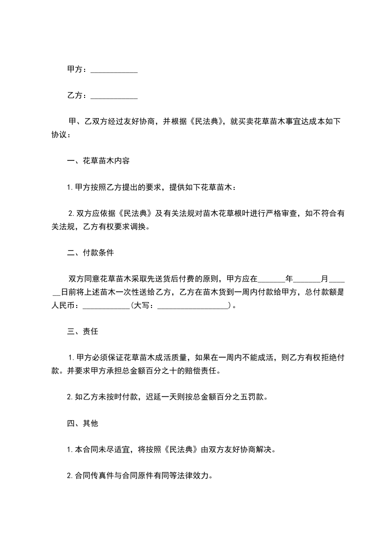 一、甲方向乙方采购苗木_______株,金额为人民币________.甲方与乙方按实际采购苗木数量,按实结算。