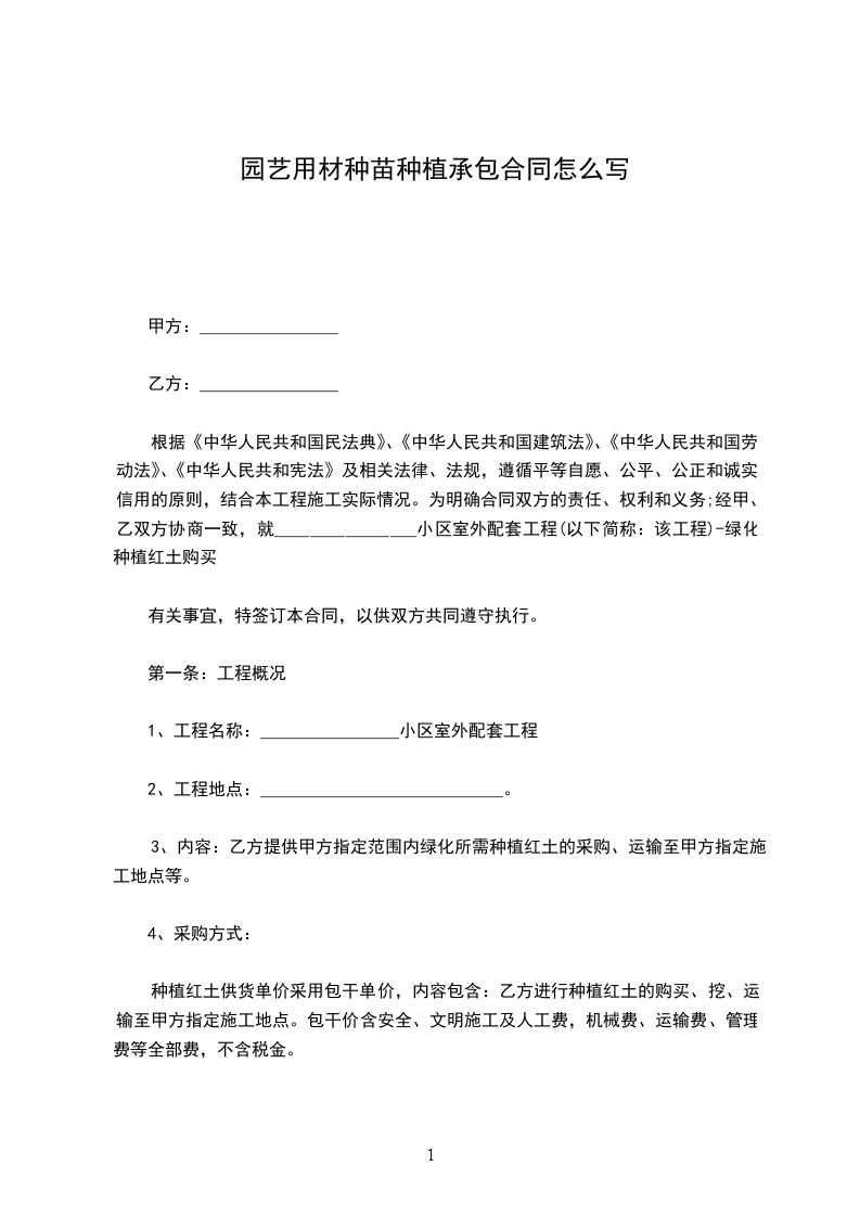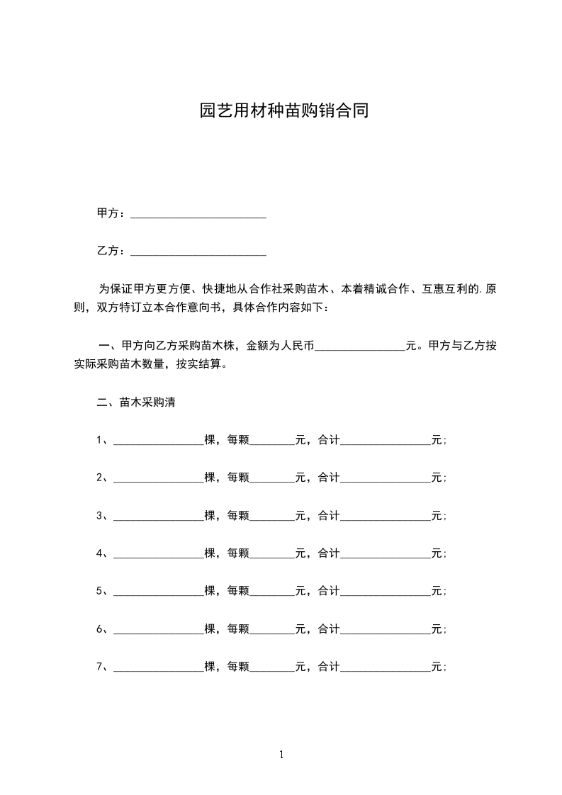 一、甲方向乙方采购苗木株,金额为人民币________________元。甲方与乙方按实际采购苗木数量,按实结算。