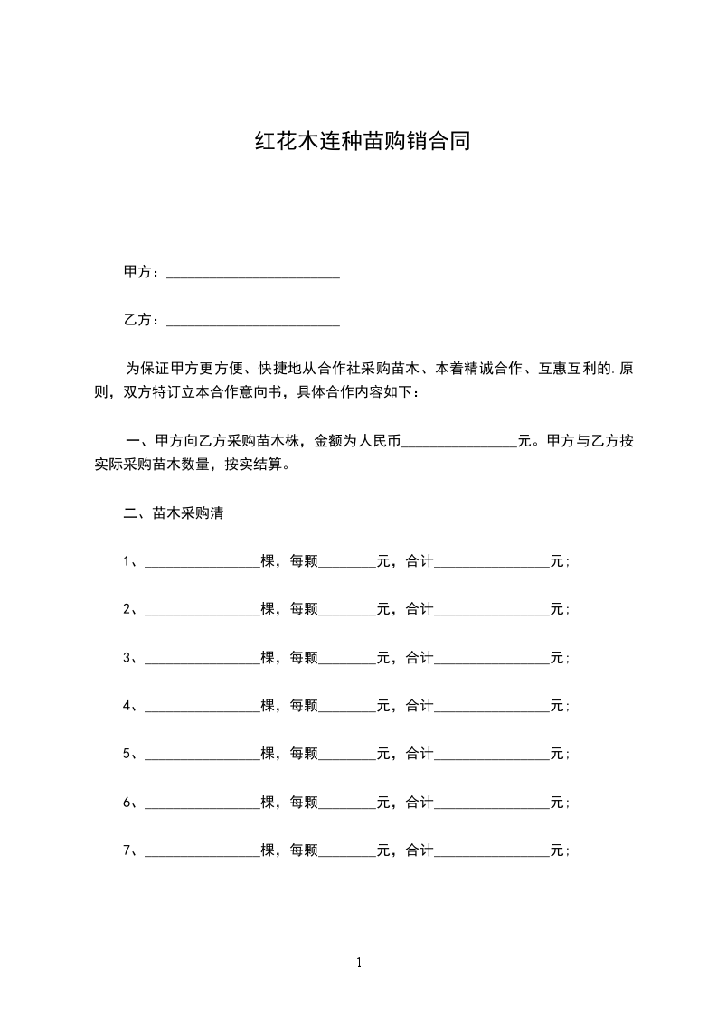 一、甲方向乙方采购苗木株,金额为人民币________________元。甲方与乙方按实际采购苗木数量,按实结算。