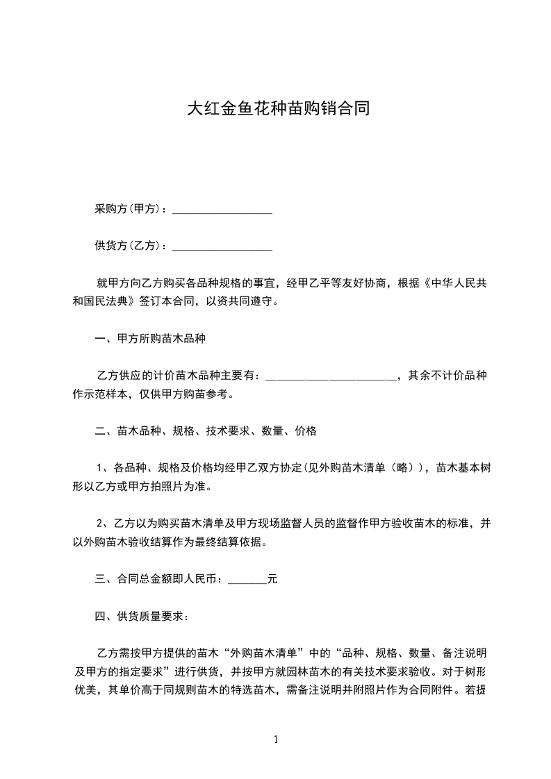 1、各品种、规格及价格均经甲乙双方协定(见外购苗木清单(略)),苗木基本树形以乙方或甲方拍照片为准。
