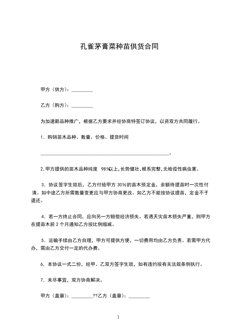 3.协议签字生效后,乙方付给甲方30%的苗木预定金,余额待提苗时一次性付清。如中途乙方所需数量变更应与甲方协商更改。如乙方不能按协议提苗,定金不予退还。