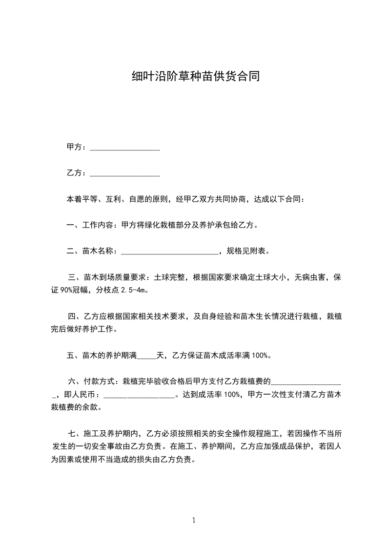 八、违约责任:若任何一方违约则支付守约方总额___________________的违约费。乙方苗木到场后经甲方验收后开始栽植,甲方应按时支付苗木款。