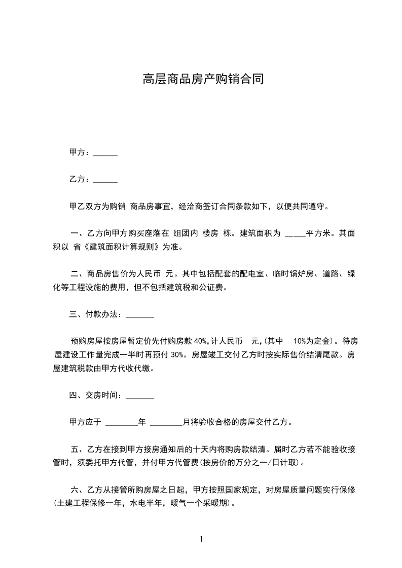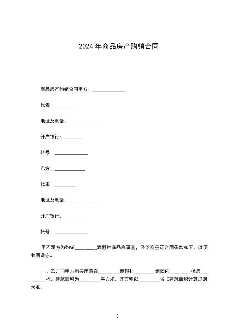 一、乙方向甲方购买座落在____渡假村____组团内____楼房____栋。建筑面积为____平方米。其面积以____省《建筑面积计算规则》为准。