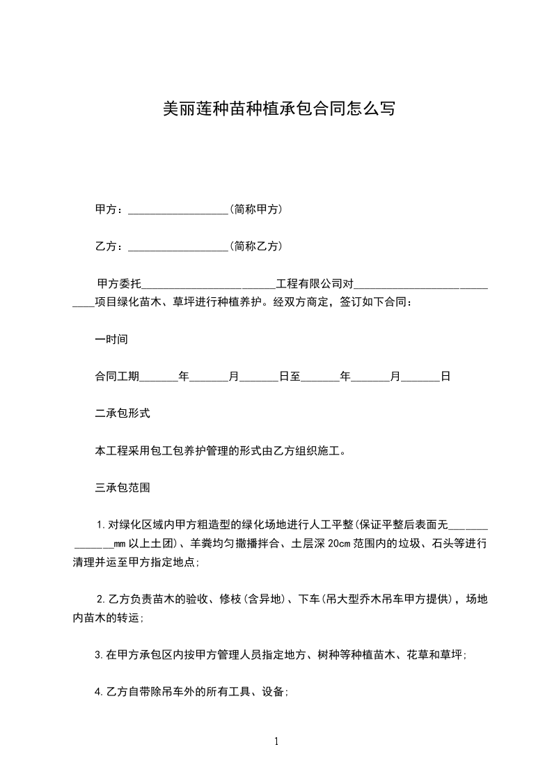 一、甲方向乙方采购苗木,具体的苗木品种、规格、单价等见本合同附件(苗木采购确认表)所列内容。本合同总价为人民币______________元。如遇甲方场地受限等原因不能全部种植,经双方协商,乙方需按甲方实际需要苗木数量进行供苗,按实结算;多出部分甲方有权不予接收或退还,由乙方自行处理。