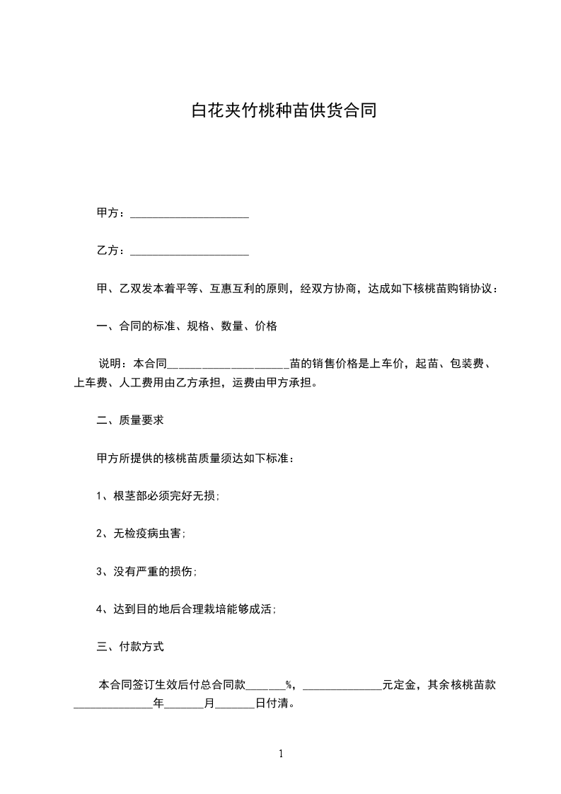 1、乙方应按合同规定的时间和质量,提供给甲方所需的核桃苗,保证不提供假苗。