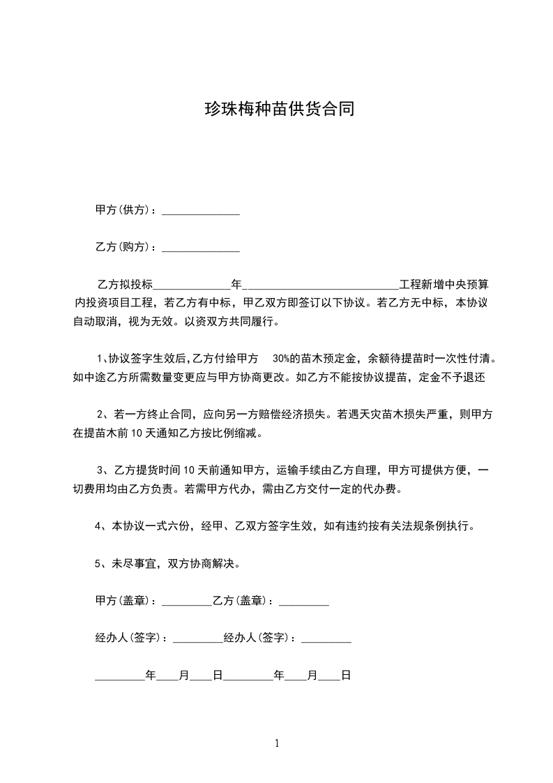 1、协议签字生效后,乙方付给甲方30%的苗木预定金,余额待提苗时一次性付清。如中途乙方所需数量变更应与甲方协商更改。如乙方不能按协议提苗,定金不予退还。