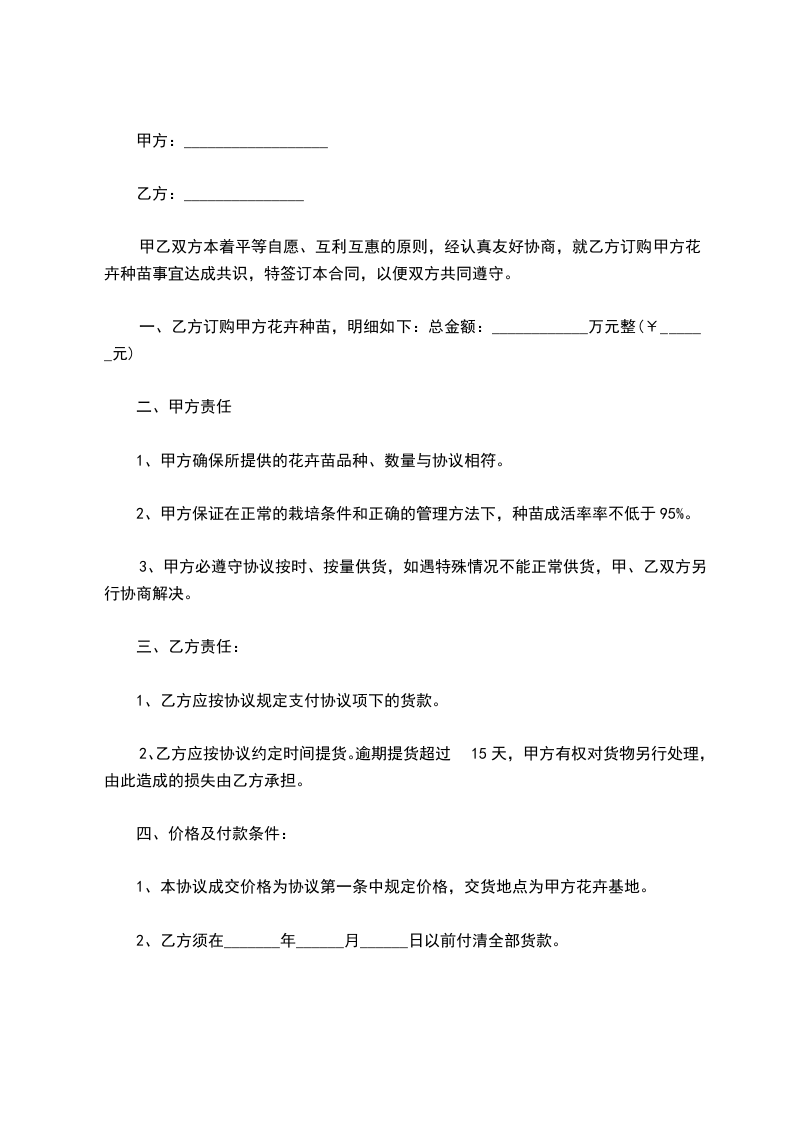 一、乙方订购甲方花卉种苗,明细如下:总金额:____________万元整(¥______元)