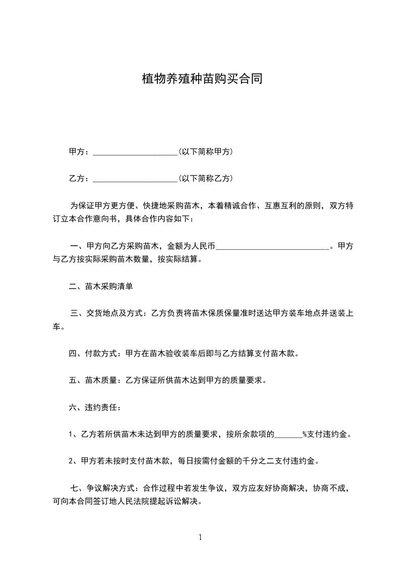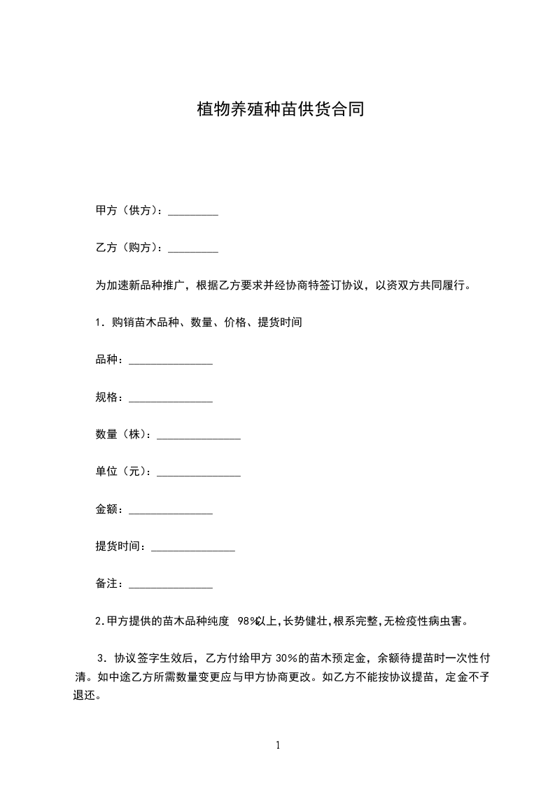 3.协议签字生效后,乙方付给甲方30%的苗木预定金,余额待提苗时一次性付清。如中途乙方所需数量变更应与甲方协商更改。如乙方不能按协议提苗,定金不予退还。