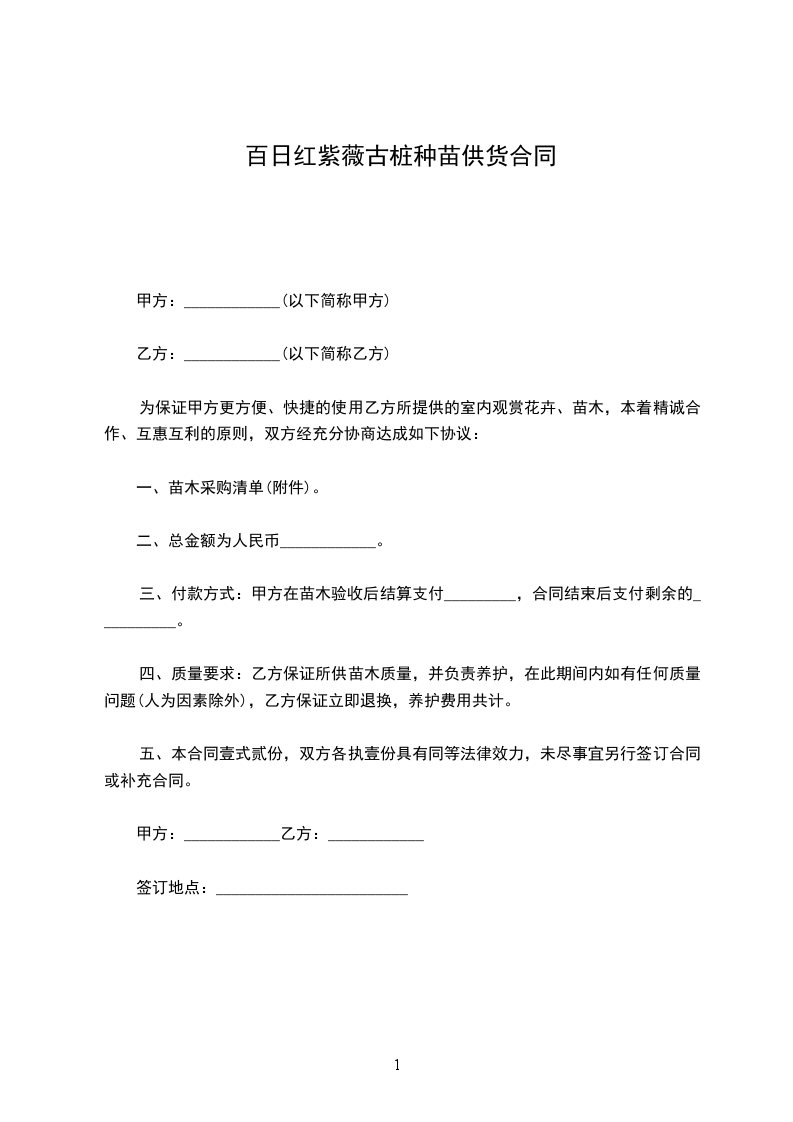 四、质量要求:乙方保证所供苗木质量,并负责养护,在此期间内如有任何质量问题(人为因素除外),乙方保证立即退换,养护费用共计。