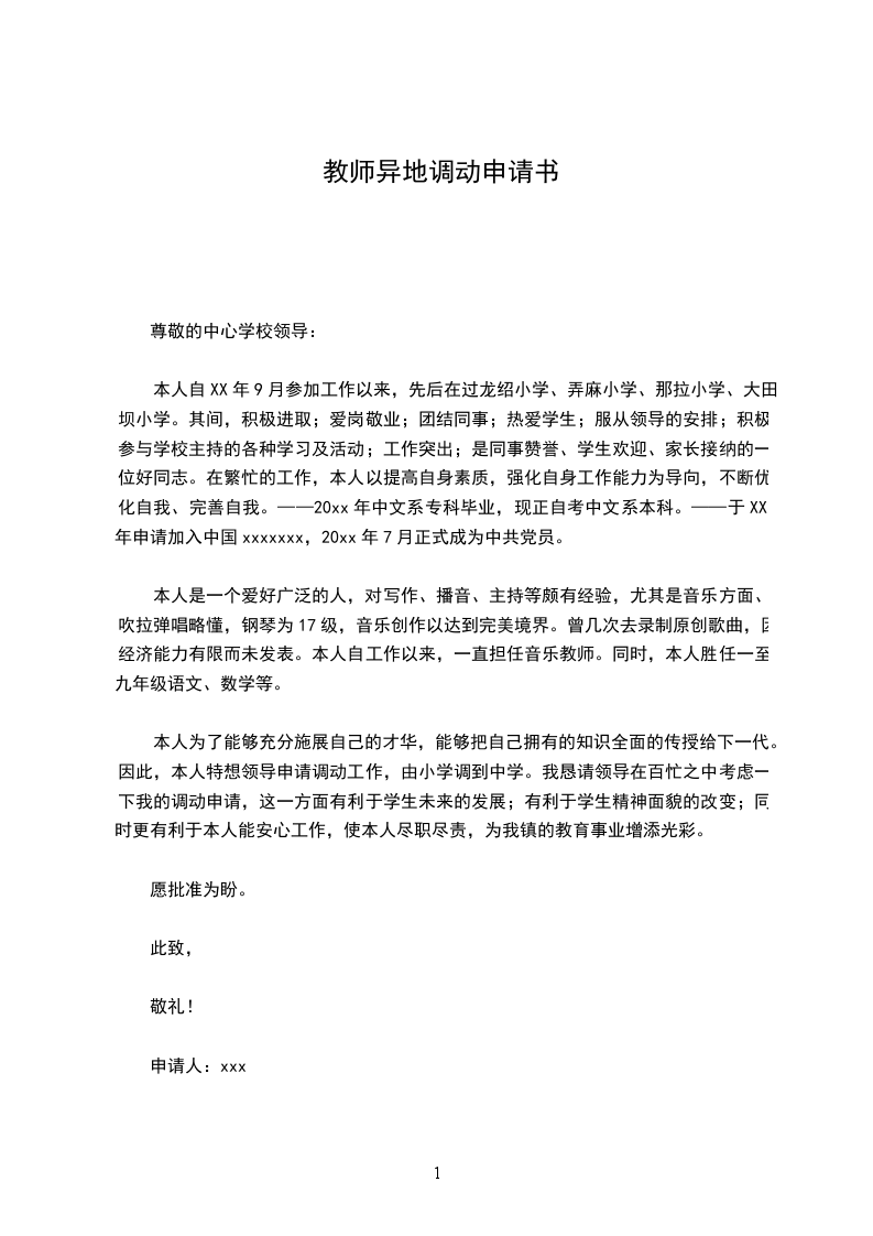 本人为了能够充分施展自己的才华,能够把自己拥有的知识全面的传授给下一代。因此,本人特想领导申请调动工作,由小学调到中学。我恳请领导在百忙之中考虑一下我的调动申请,这一方面有利于学生未来的发展;有利于学生精神面貌的改变;同时更有利于本人能安心工作,使本人尽职尽责,为我镇的教育事业增添光彩。