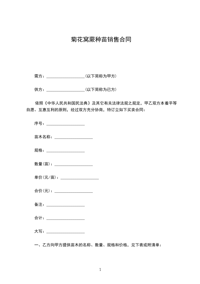 一、甲方向乙方采购苗木,具体的苗木品种为________________,规格为________________厘米,数量为________株,树龄为________年。
