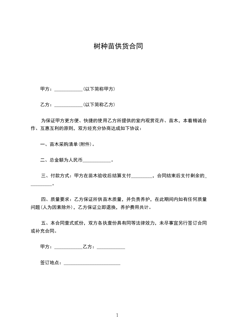 一、甲方向乙方采购苗木_____棵,金额为__________________________________________元整、甲方与乙方按实际采购苗木数量,按实结算。