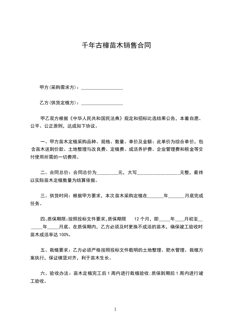 千年古樟苗木销售合同