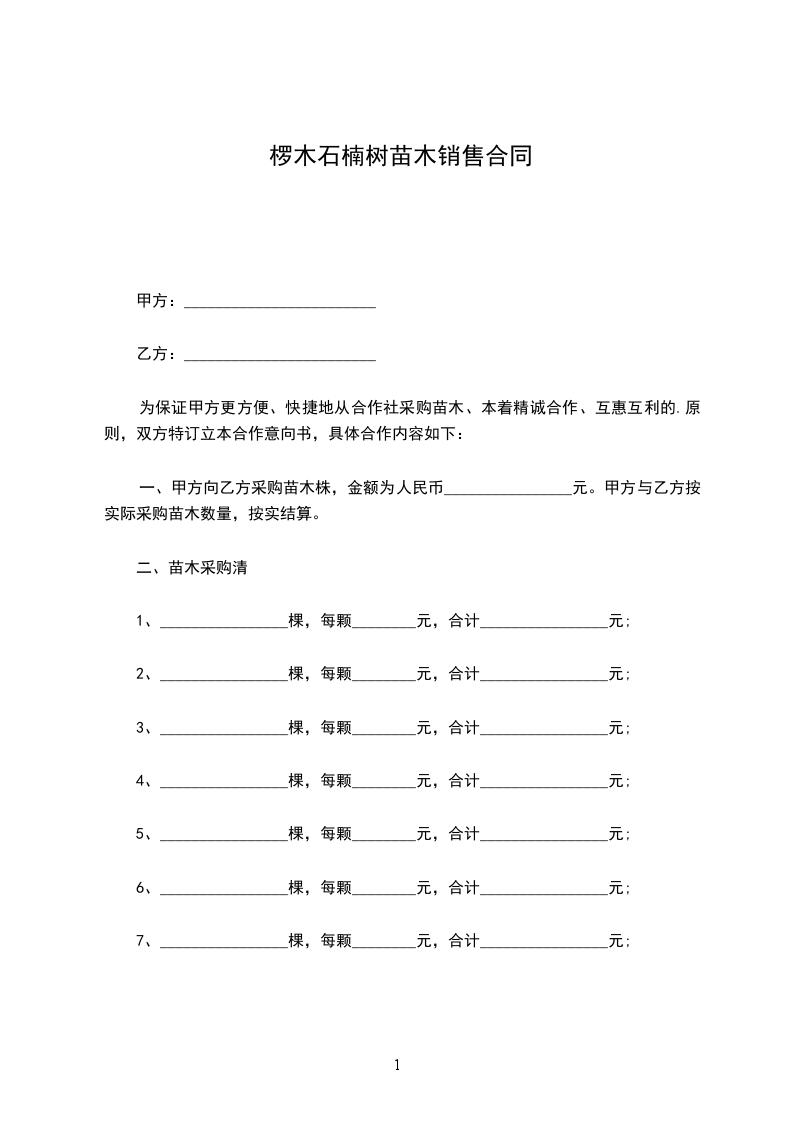 一、甲方向乙方采购苗木株,金额为人民币________________元。甲方与乙方按实际采购苗木数量,按实结算。