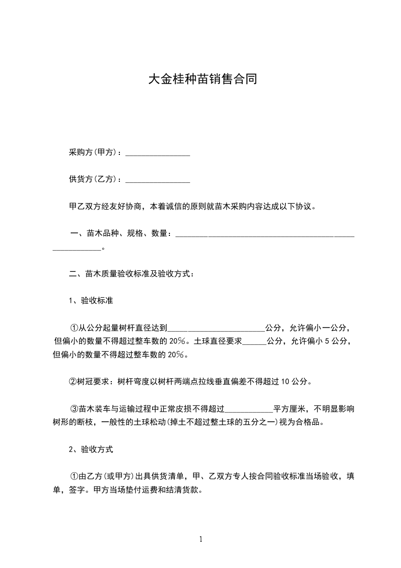 本合同中苗木单价为苗木的包干结算价格,包括苗木采购、起挖、包装、装车费用。货到甲方指定工地位置验收合格后,甲方向乙方支付苗木款的__________%,待甲方所需苗木乙方供货完成后,三个月后甲方向乙方付清余下的。