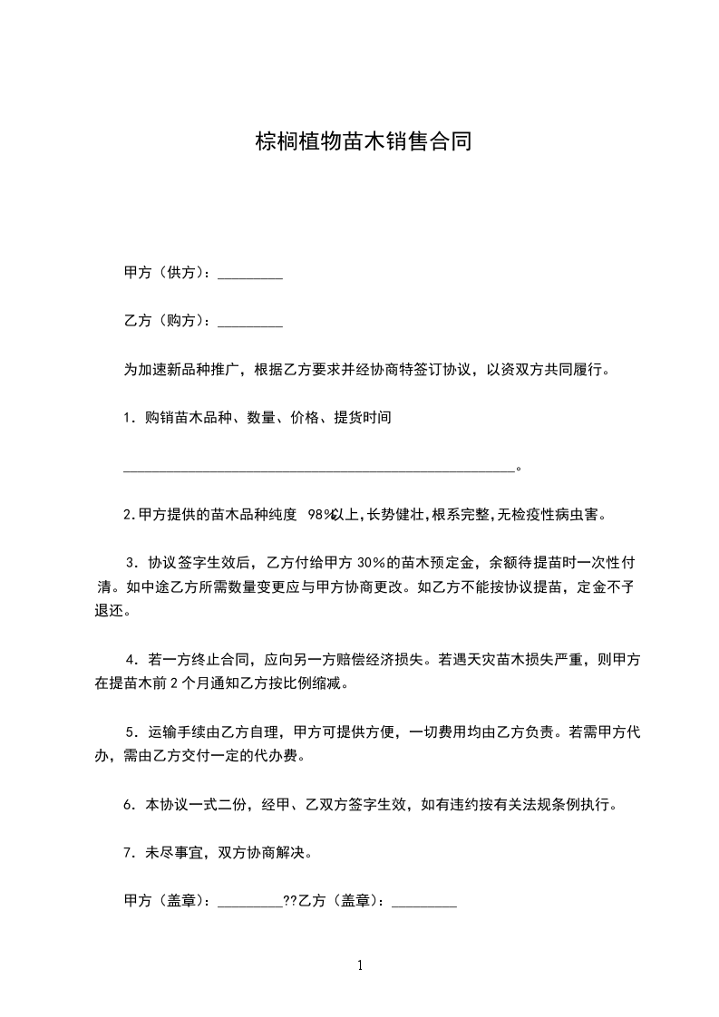 3.协议签字生效后,乙方付给甲方30%的苗木预定金,余额待提苗时一次性付清。如中途乙方所需数量变更应与甲方协商更改。如乙方不能按协议提苗,定金不予退还。