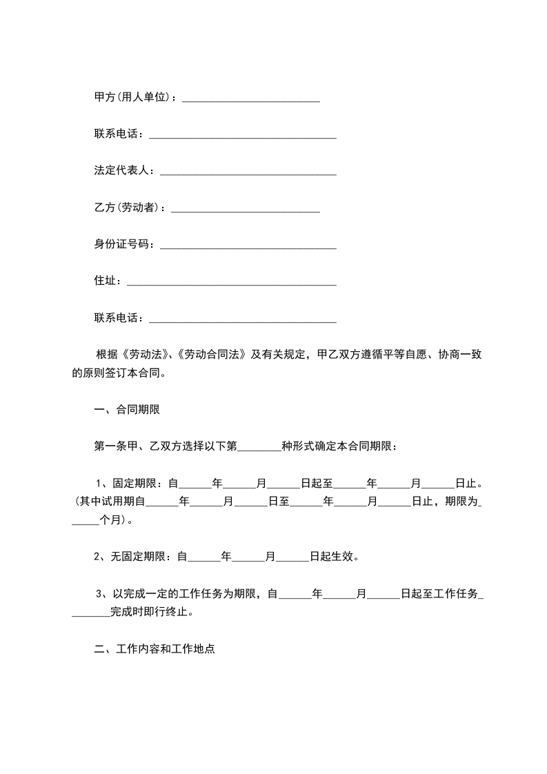 1、固定期限:自______年______月______日起至______年______月______日止。(其中试用期自______年______月______日至______年______月______日止,期限为______个月)。
