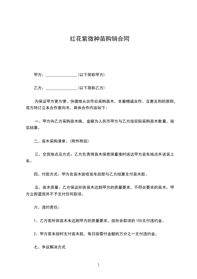 一、甲方向乙方采购苗木株,金额为人民币甲方与乙方按实际采购苗木数量,按实结算。