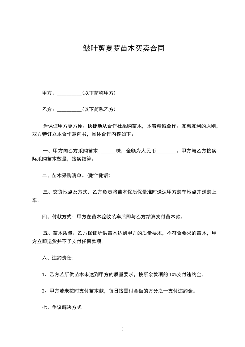 一、甲方向乙方采购苗木_______株,金额为人民币________。甲方与乙方按实际采购苗木数量,按实结算。