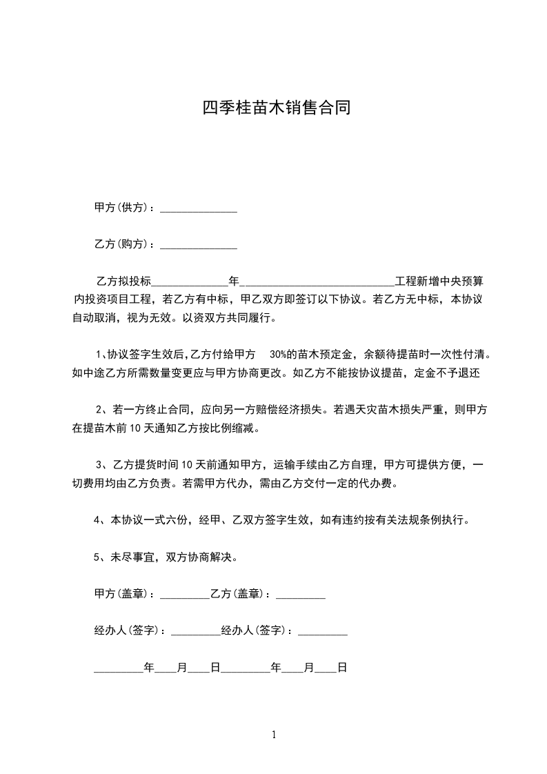 1、协议签字生效后,乙方付给甲方30%的苗木预定金,余额待提苗时一次性付清。如中途乙方所需数量变更应与甲方协商更改。如乙方不能按协议提苗,定金不予退还。