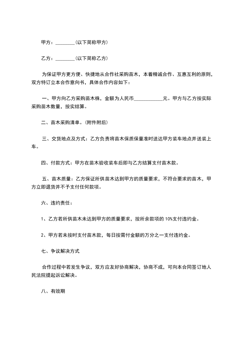 九、乙方违约责任:本合同的苗木质量保证金暂定交纳_____万元,苗木质量(规格、数量、包装、运输、质量)不符合规定,甲方有权退苗木。乙方负责在本合同约定的时间内向甲方提供数量相当的合格苗木,如乙方负责在本合同约定的时间内向甲方提供数量相当的合格苗木,如乙方未能按时向甲方提供本合同约定的合格苗木,则乙方应会给甲方苗木总价15%的违约金,本合同自运终止,甲有权另选供苗商。