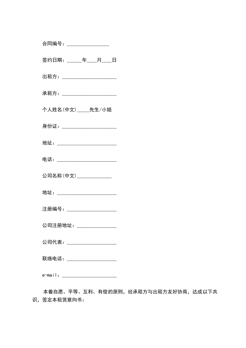 本着自愿、平等、互利、有偿的原则,经承租方与出租方友好协商,达成以下共识,签定本租赁意向书: