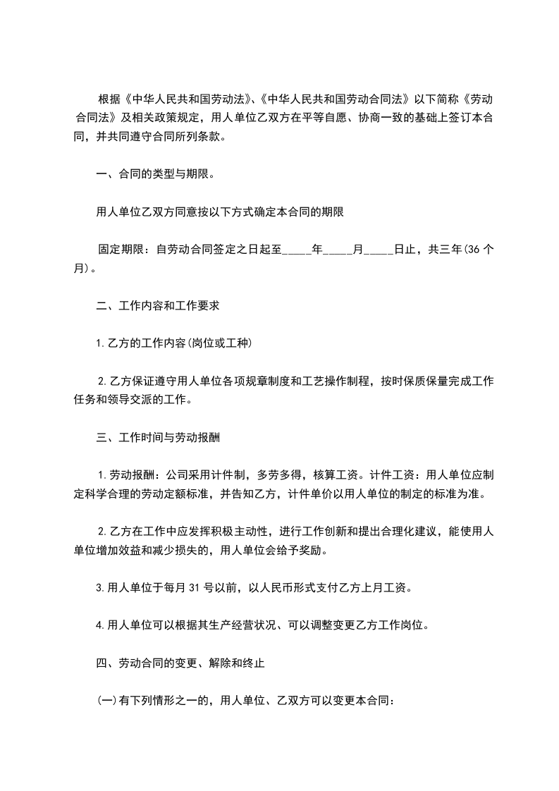 1.劳动报酬:公司采用计件制,多劳多得,核算工资。计件工资:用人单位应制定科学合理的劳动定额标准,并告知乙方,计件单价以用人单位的制定的标准为准。