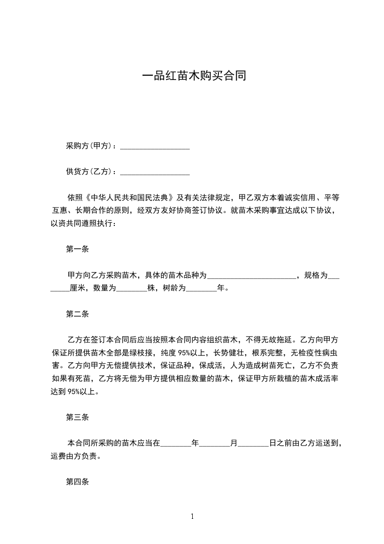 一、甲方向乙方采购苗木,具体的苗木品种为________________,规格为________________厘米,数量为________株,树龄为________年。