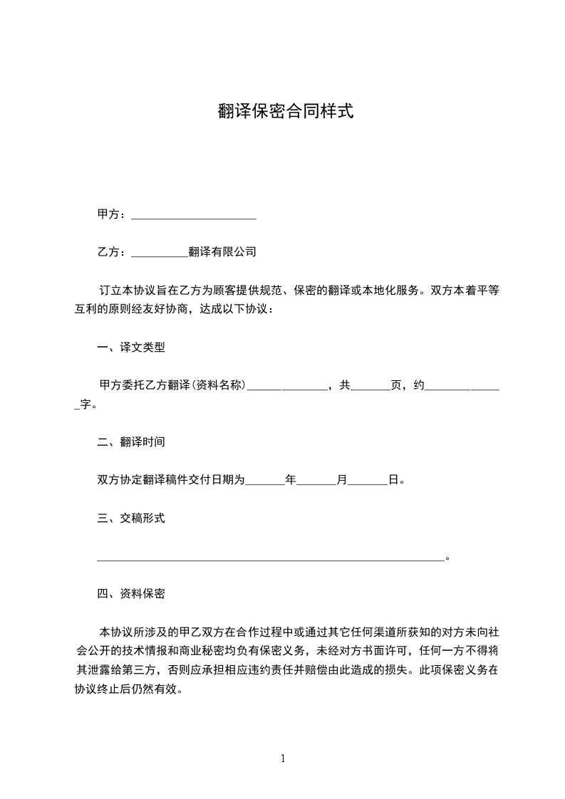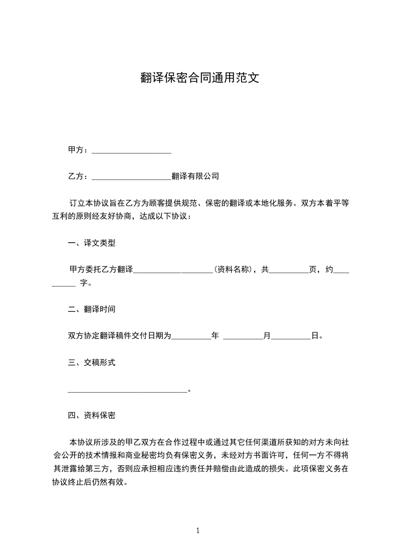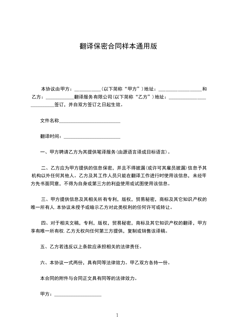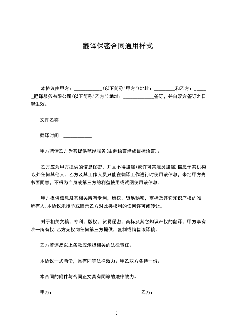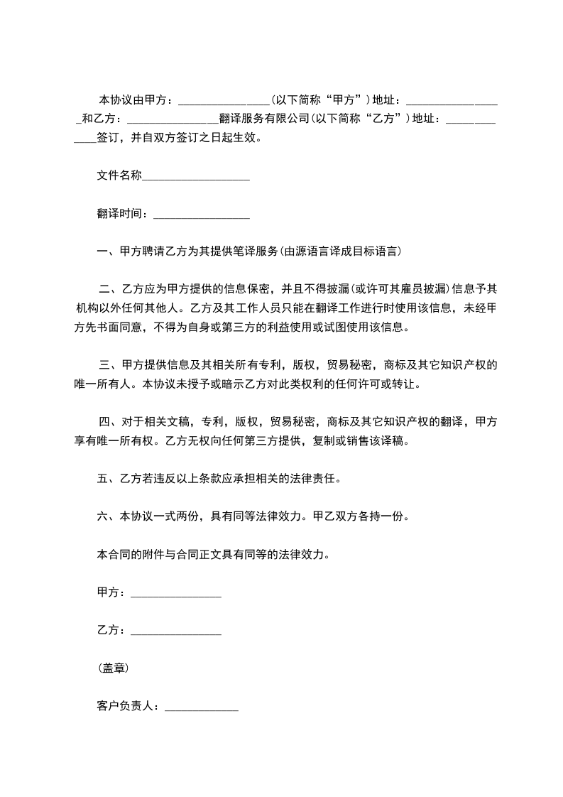 一、甲方聘请乙方为其提供笔译服务(由源语言译成目标语言)。