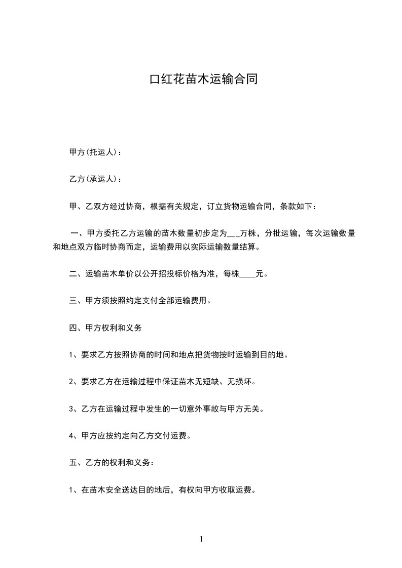 一、甲方向乙方采购苗木_____株,金额为_____人民币。甲方与乙方按实际采购苗木数量,按实际结算。