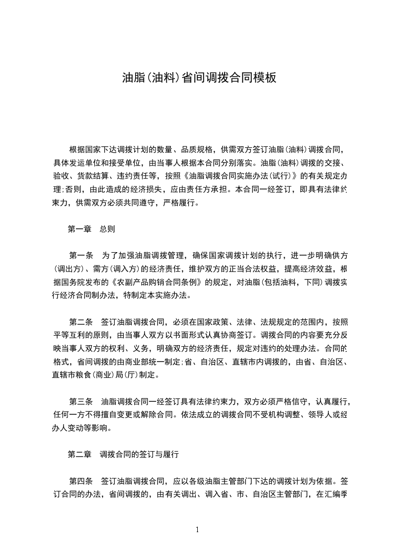 第二条 签订油脂调拨合同,必须在国家政策、法律、法规规定的范围内,按照平等互利的原则,由当事人双方以书面形式认真协商签订。调拨合同的内容要充分反映当事人双方的权利、义务,明确双方的经济责任,规定对违约的处理办法。合同的格式,省间调拨的由商业部统一制定;省、自治区、直辖市内调拨的,由省、自治区、直辖市粮食(商业)局(厅)制定。