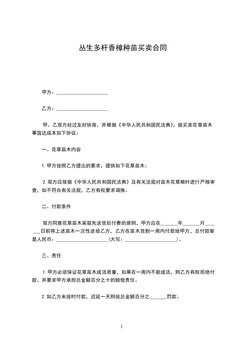 3.合同签字生效后,乙方付给甲方30%的苗木预定金,余额待提苗时一次性付清。如中途乙方所需数量变更应与甲方协商更改。如乙方不能按合同提苗,定金不予退还。