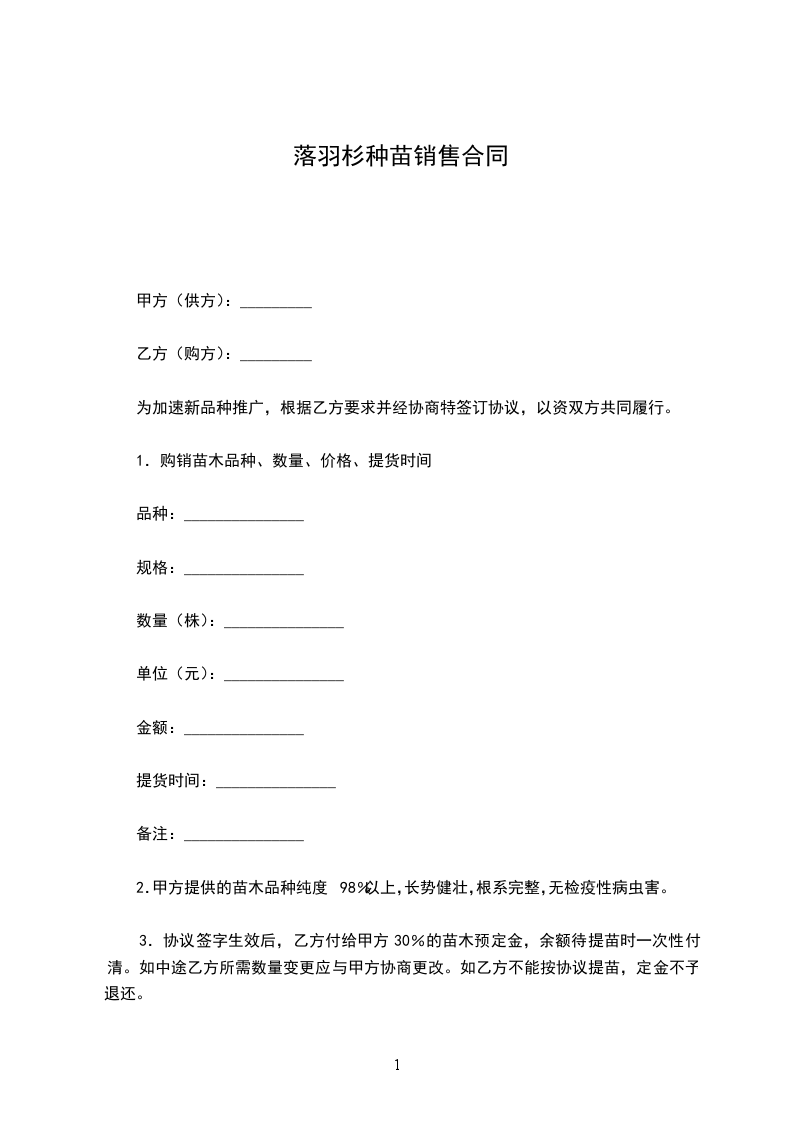 3.协议签字生效后,乙方付给甲方30%的苗木预定金,余额待提苗时一次性付清。如中途乙方所需数量变更应与甲方协商更改。如乙方不能按协议提苗,定金不予退还。