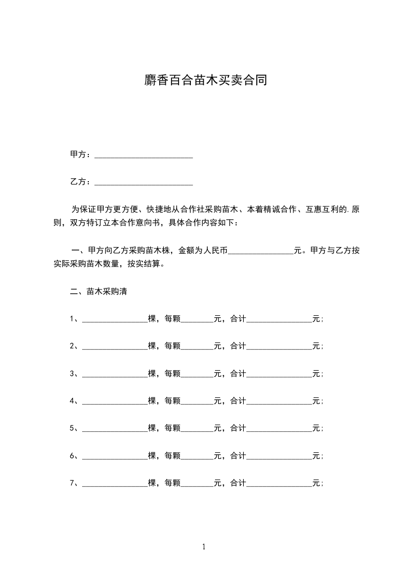 一、甲方向乙方采购苗木株,金额为人民币________________元。甲方与乙方按实际采购苗木数量,按实结算。