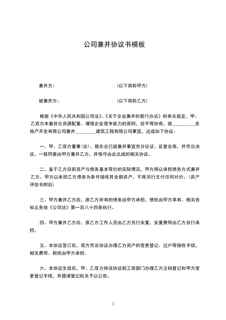根据《中华人民共和国公司法》、《关于企业兼并的暂行办法》的有关规定,甲、乙双方本着优化资源配置、增强企业竞争能力的原则,经平等协商,就__________房地产开发有限公司兼并_________建筑工程有限公司事宜,达成如下协议: