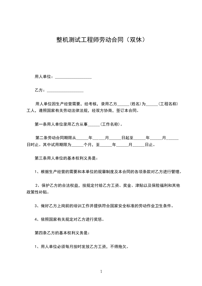用人单位因生产经营需要,经考核,录用乙方______(姓名)为______(工程名称)工人,遵照国家有关劳动法律法规,经双方协商,签订本合同。