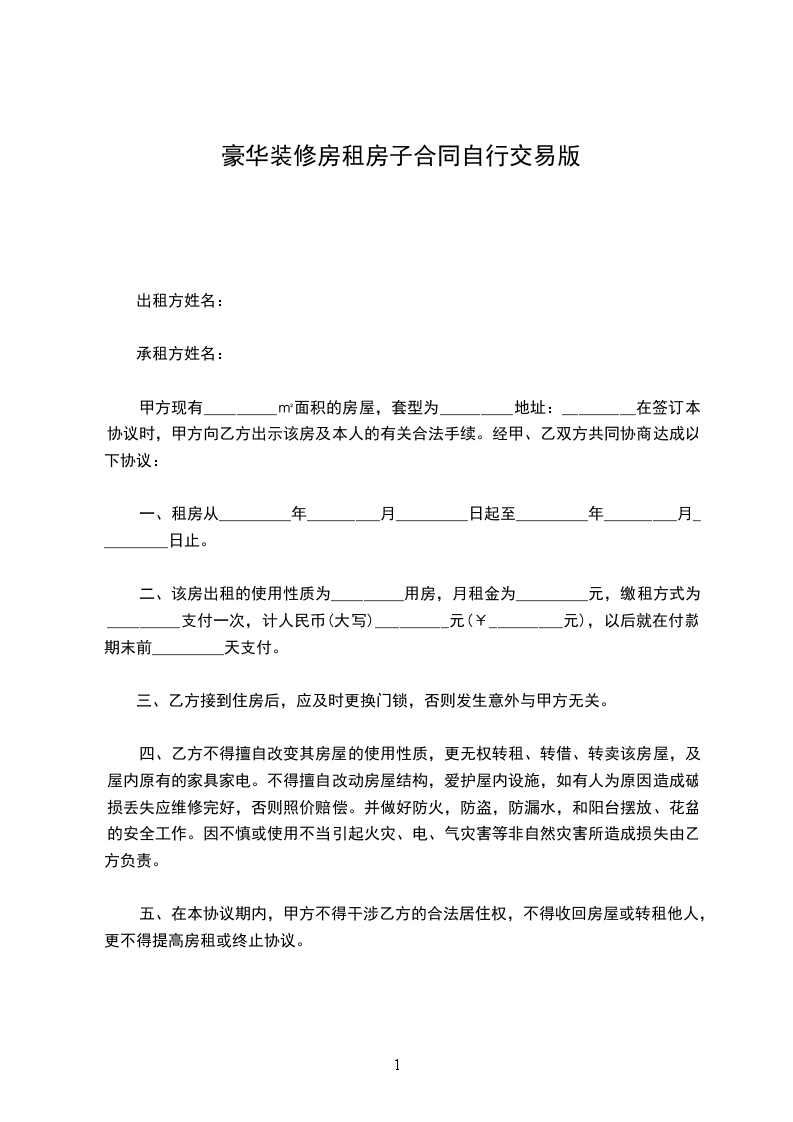 二、该房出租的使用性质为_________用房,月租金为_________元,缴租方式为_________支付一次,计人民币(大写)_________元(¥_________元),以后就在付款期末前_________天支付。