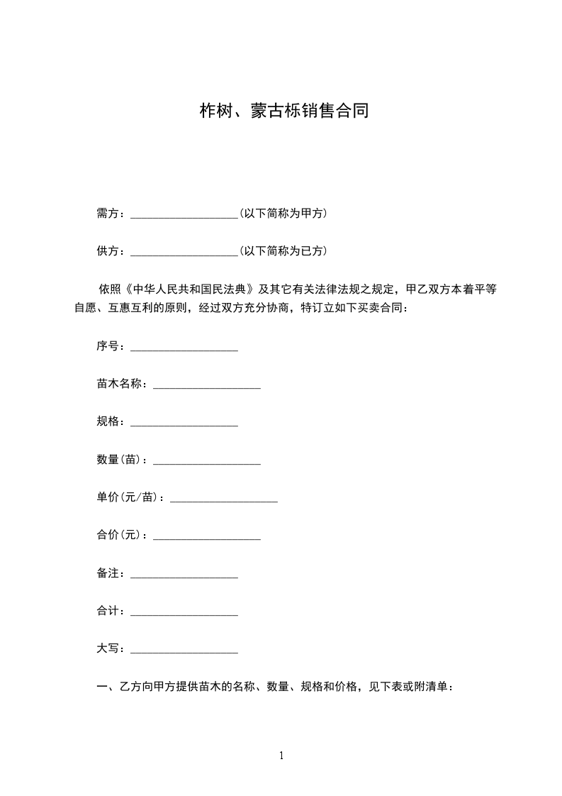 柞树、蒙古栎种苗销售合同